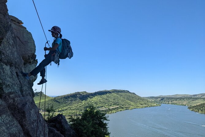 Guided cliff rappelling and climbing above Horsetooth Reservoir
